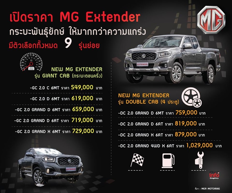 ค่ายรถยนต์ เอ็มจี เปิดตัว NEW MG EXTENDER ปิกอัพรุ่นแรก ภายใต้คอนเซปต์ “กระบะพันธุ์ยักษ์ ให้มากกว่าความแกร่ง” ชูจุดเด่นมิติตัวถังขนาดใหญ่ ขุมพลัง 2.0 ลิตร เทอร์โบ แปรผัน ให้กำลังสูงสุด 161 แรงม้า แรงบิด 375 นิวตันเมตร มาพร้อมระบบปฏิบัติการอัจฉริยะ i-SMART รองรับการสั่งการด้วยเสียงภาษาไทยครั้งแรกของโลก เคาะราคาเริ่มต้น 549,000-1,029,000 บาท