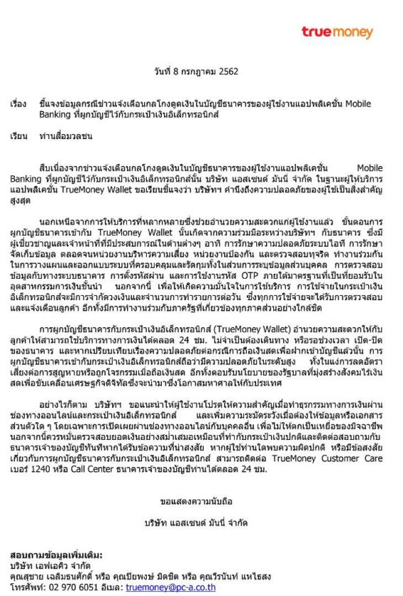 จากนั้น ผู้เสียหายจะได้รับการแจ้งเตือนผ่านโทรศัพท์มือถือ ในทำนองว่า “คุณต้องการที่จะให้บัญชีธนาคารของคุณเชื่อมต่อกับกระเป๋าเงินอิเล็กทรอนิกส์ หรือไม่” แต่การแจ้งเตือนนั้นมีข้อความค่อนข้างยาว ทำให้ผู้เสียหายหลายรายไม่อยากอ่าน และมองว่าไม่น่าจะมีอันตรายอะไรเกิดขึ้นนั้น ล่าสุด ทรูมันนี่ (ประเทศไทย) ส่งจดหมายชี้แจงกรณีข่าวแจ้งเตือนภัยดูดเงินออนไลน์ โดยระบุว่าที่มีการอ้างถึงแบรนด์ True Wallet (TrueMoney Wallet) ในเว็บไซต์ ลงวันที่ 5 กรกฎาคม ระบุว่า สืบเนื่องจากข่าวแจ้งเตือนกลโกงดูดเงินในบัญชีธนาคารของผู้ใช้งานแอปพลิเคชัน Mobile Banking ที่ผูกบัญชีไว้กับกระเป๋าเงินอิเล็กทรอนิกส์นั้น บริษัท แอสเซนด์ มันนี่ จำกัด ในฐานะผู้ให้บริการแอปพลิเคชัน TrueMoney Wallet ขอเรียนชี้แจงว่า บริษัทฯ คำนึงถึงความปลอดภัยของผู้ใช้เป็นสิ่งสำคัญสูงสุด