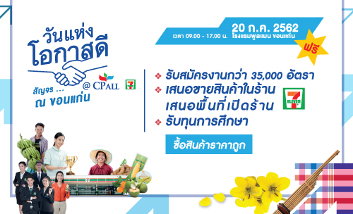 งาน “วันแห่งโอกาสดี @ CP ALL สัญจร ณ ขอนแก่น”จัดขึ้นตามปณิธานขององค์กรที่ต้องการสร้างสรรค์และแบ่งปันโอกาสให้ทุกคน โดยในงานนี้จะมีกิจกรรมที่หลากหลาย เพื่อมอบโอกาสในมิติต่างๆ ทั้งโอกาสทางธุรกิจ โอกาสทางอาชีพ และโอกาสทางการศึกษา