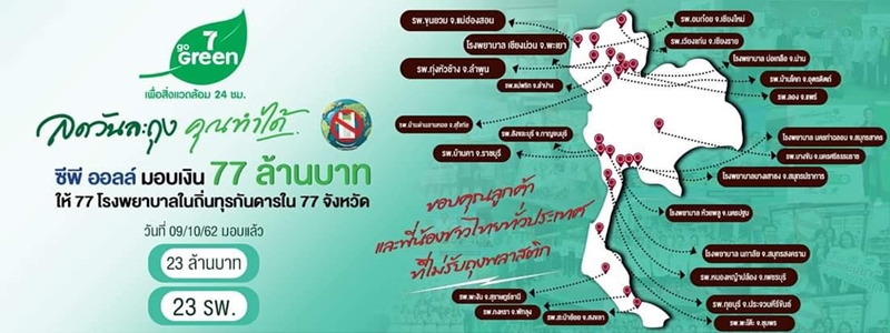 ซีพีออลล์เดินหน้ามอบเงิน 77 ล้านบาทให้ 77 โรงพยาบาล 77 จังหวัดจากโครงการลดวันละถุงคุณทำได้ เฟส 2 โดยมอบให้โรงพยาบาลละ 1 ล้านบาท ทั้งนี้ได้มอบเงินถึง ณ วันที่ 9 ตุลาคม รวม 23 โรงพยาบาล ได้แก่โรงพยาบาลขุนยวม จ.แม่ฮ่องสอน โรงพยาบาลเชียงม่วน จ.พะเยา โรงพยาบาลทุ่งหัวช้าง จ.ลำพูน โรงพยาบาลแม่พริก จ.ลำปาง โรงพยาบาลบ้านคา จ.ราชบุรี โรงพยาบาลสังขละบุรี จ.กาญจนบุรี โรงพยาบาลอมกิอย จ.เชียงใหม่ โรงพยาบาลเวียงแก่น จ.เชียงราย โรงพยาบาลบ่อเกลือ จ.น่าน โรงพยาบาลบ้านโคก จ.อุตรดิตถ์