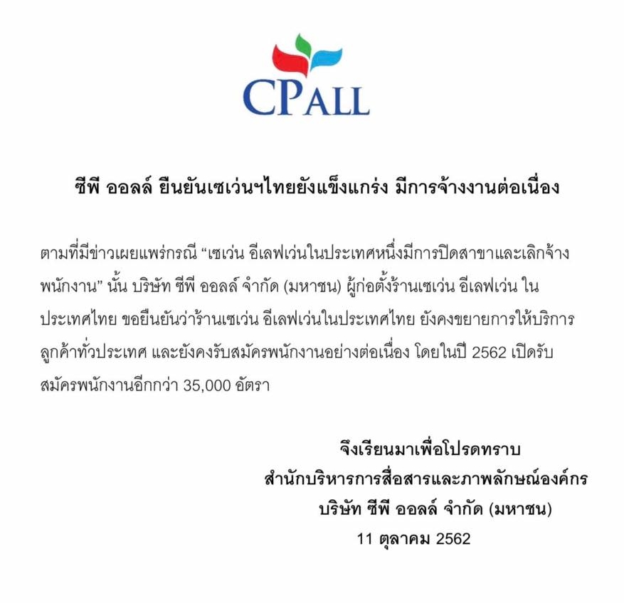 ตามที่มีข่าวเผยแพร่กรณี “เซเว่น อีเลฟเว่น” ในประเทศหนึ่งมีการปิดสาขา และเลิกจ้างพนักงาน นั้น บริษัท ซีพี ออลล์ จำกัด (มหาชน) ผู้ก่อตั้งร้านเซเว่น อีเลฟเว่น ในประเทศไทย ขอยืนยันว่าร้านเซเว่น อีเลฟเว่นในประเทศไทย ยังคงขยายการให้บริการลูกค้าทั่วประเทศ และยังคงรับสมัครพนักงานอย่างต่อเนื่อง โดยในปี 2562 เปิดรับสมัครพนักงานอีกกว่า 35,000 อัตรา