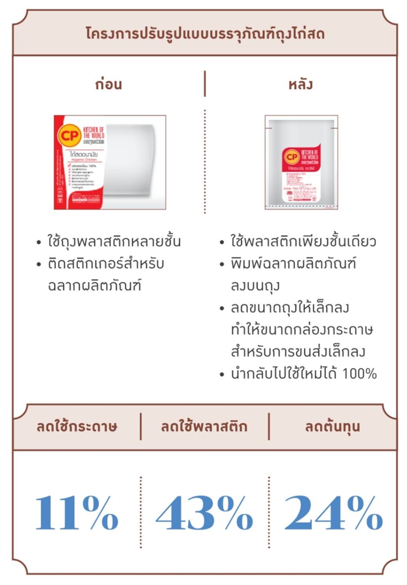 คุณวุฒิชัย สิทธิปรีดานันท์ รองกรรมการผู้จัดการอาวุโส ด้านความรับผิดชอบต่อสังคมและการพัฒนาอย่างยั่งยืน ซีพีเอฟ กล่าวว่า บริษัทได้ออกแบบและพัฒนานวัตกรรมบรรจุภัณฑ์อาหารอย่างต่อเนื่องเพื่อให้เกิดการใช้ทรัพยากรอย่างเกิดประโยชน์สูงสุด ยืดอายุของอาหารให้ยาวนานขึ้น ลดปัญหาขยะจากบรรจุภัณฑ์ และการสูญเสียอาหารที่ไม่ถูกบริโภค (Food Waste) ควบคู่ไปกับการส่งเสริมการใช้วัสดุที่ช่วยลดผลกระทบต่อสิ่งแวดล้อมตามนโยบายบรรจุภัณฑ์ที่ยั่งยืนบนพื้นฐานแนวคิดเศรษฐกิจหมุนเวียน (Circular Economy) ยกตัวอย่างเช่น การปรับรูปแบบบรรจุภัณฑ์ถุงไก่สด ให้เหลือพลาสติกเพียงชั้นเดียวแทนการใช้พลาสติกหลายชั้นทำให้บรรจุภัณฑ์แบบใหม่ใช้พลาสติกน้อยลงถึง 43% โดยไม่กระทบต่อการรักษาคุณภาพของผลิตภัณฑ์ นอกจากนี้วัสดุที่ใช้ยังสามารถนำกลับมาใช้ใหม่ได้ทั้งหมด