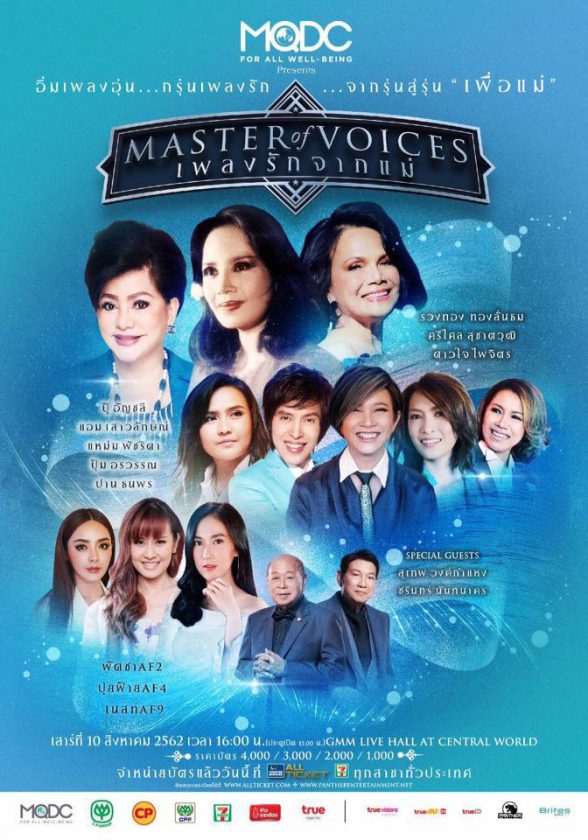 คอนเสิร์ต “MQDC Presents MASTER OF VOICES CONCERT เพลงรักจากแม่” จะเปิดจำหน่ายบัตรวันที่ 13 กรกฎาคม นี้ โดยบัตรราคา 4,000 3,000 2,000 1,000 จำหน่ายที่ All Ticket @ เคาท์เตอร์ เซอร์วิส ทุกสาขา ( www.allticket.com )