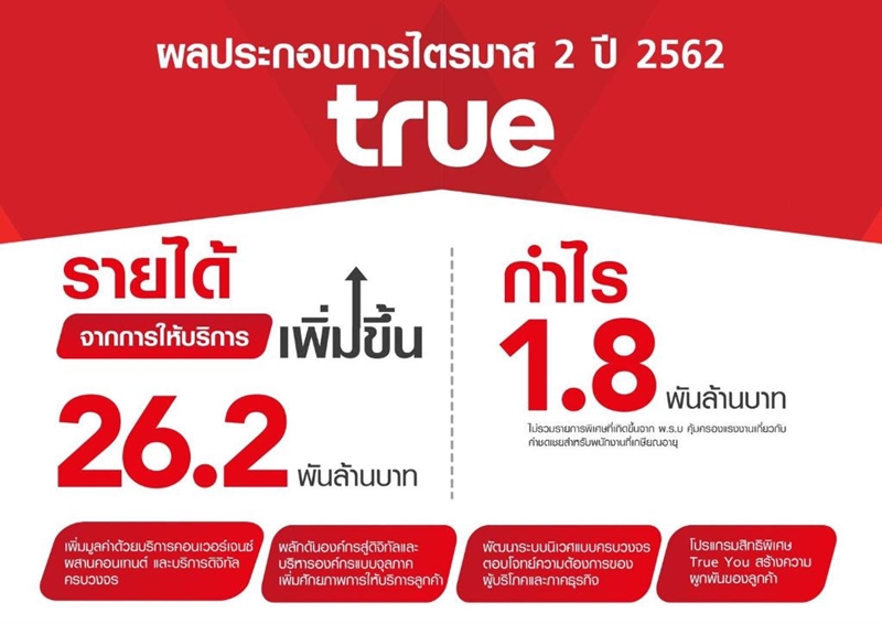 คุณศิริพจน์ คุณากรพันธุ์ กรรมการผู้จัดการใหญ่ (ร่วม) กล่าวเสริมว่า กลุ่มทรูมุ่งเน้นกลยุทธ์ การทำการตลาด และการบริหารพื้นที่แบบจุลภาคอย่างมีประสิทธิภาพ อีกทั้งยังเดินหน้าผลักดันองค์กรสู่ดิจิทัลมากขึ้น ทำให้สร้างผลกำไรได้อย่างต่อเนื่องในปีนี้