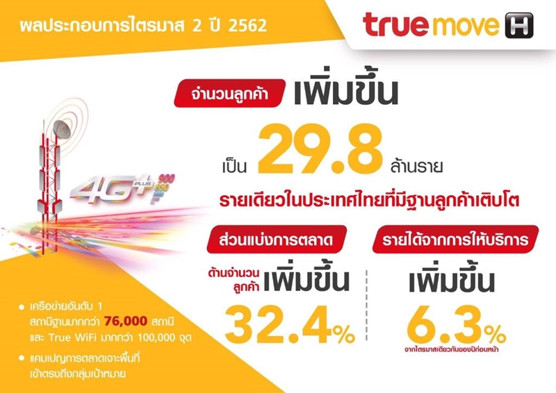 สำหรับผลประกอบการแยกแต่ละหน่วยธุรกิจทรูมูฟ เอช มีรายได้จากการให้บริการ 1.95 หมื่นล้านบาทในไตรมาส 2 ปี 2562 ลูกค้ารายเดือนเพิ่มขึ้นจากไตรมาสก่อนหน้ากว่า 3% รวมแล้วในไตรมาส 2 ทรูมูฟ เอช มีลูกค้าเพิ่มขึ้น 229,200 ราย รวมเป็น 29.8 ล้านราย คิดเป็นส่วนแบ่ง 32.4% ของตลาด