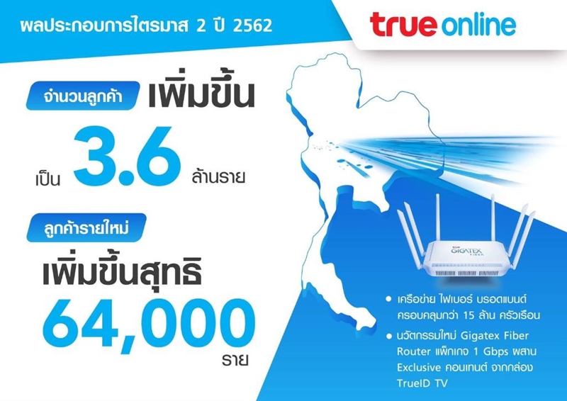 ส่วน ทรูออนไลน์ เพิ่มฐานลูกค้าคุณภาพได้อย่างต่อเนื่อง ด้วยการมุ่งเน้นด้านคุณภาพ รวมถึงการเพิ่มมูลค่าและสร้างความแตกต่างให้กับสินค้าและบริการ มีลูกค้าใหม่ 64,000 ราย ขยายฐานลูกค้าเพิ่มขึ้นเป็น 3.6 ล้านราย และผลักดันรายได้ให้เติบโตจากไตรมาสก่อนเป็น 6.3 พันล้านบาท