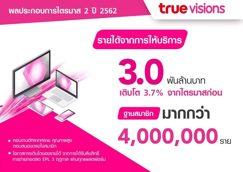 ทรูวิชั่นส์ มีรายได้จากการให้บริการที่เติบโต 3.7% จากไตรมาสก่อนเป็น 3 พันล้านบาท พร้อมขยายแพลตฟอร์มของกลุ่มทรูโดยเฉพาะกล่อง TrueID TV สามารถตอบโจทย์ไลฟ์สไตล์ของลูกค้าและขยายฐานผู้ชมคอนเทนต์เพิ่มเติมจากฐานลูกค้ากว่า 4 ล้านรายของทรูวิชั่นส์ได้
