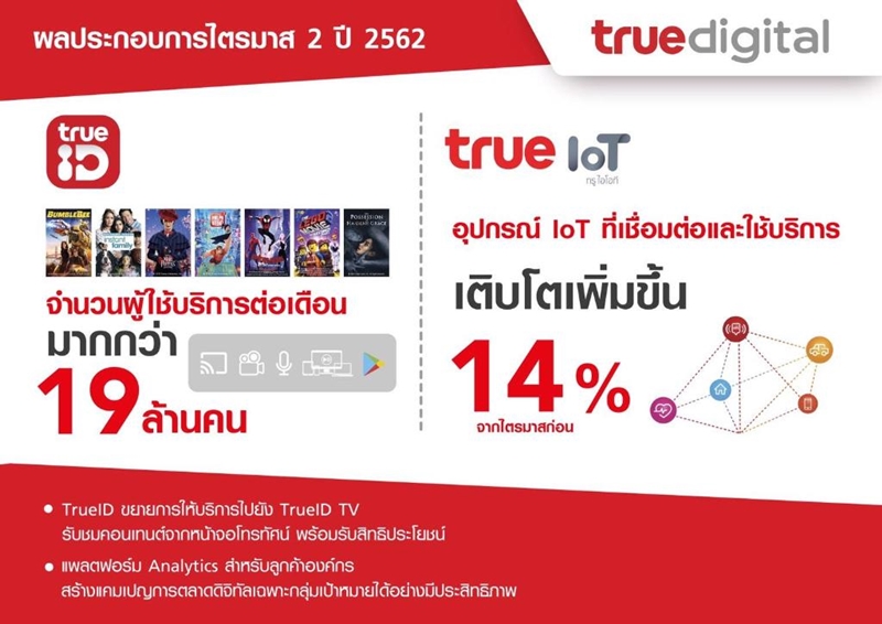 อย่างทรูไอดี มีจำนวนผู้ใช้บริการต่อเดือนมากกว่า 19 ล้านราย ณ สิ้นไตรมาส 2 ปี 2562 และบริการด้าน IoT ที่เข้าไปพัฒนาดิจิทัลโซลูชันให้กับหลากหลายอุตสาหกรรม ล่าสุดได้มีอุปกรณ์ IoT ที่เชื่อมต่อและใช้บริการมากกว่า 193,000 อุปกรณ์ ซึ่งเติบโต 14% จากไตรมาสก่อนหน้า