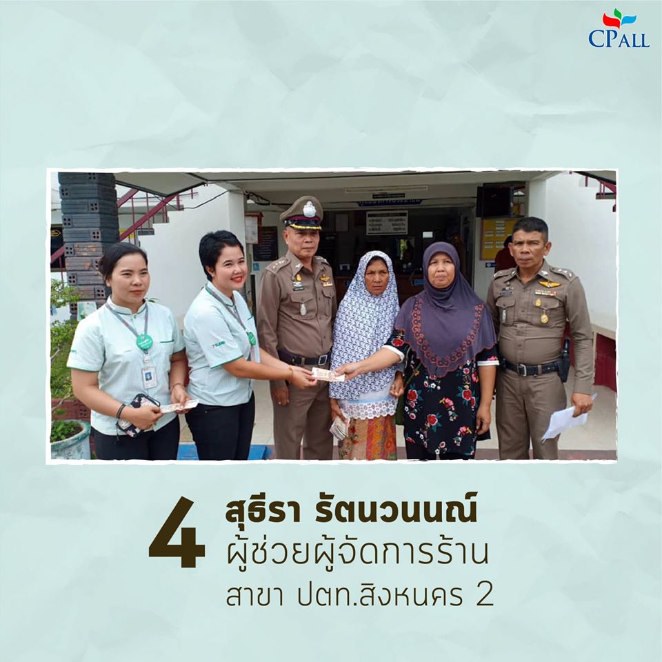 ข่าวน้ำใจงามจากชาวใต้ เมื่อมีการแชร์เรื่องราวความดีของพนักงานเซเว่นฯ สาขาปตท.สิงหนคร 2 โดยเรื่องราวเริ่มต้นเมื่อวันที่ 28 สิหาคม คุณสุธีรา รัตนวนนณ์ ผู้ช่วยผู้จัดการร้าน พบกระป๋องใบหนึ่งวางทิ้งไว้ที่หน้าเคาน์เตอร์ เมื่อเปิดดูก็พบว่ามีเงินสดจำนวนมากและทองคำอยู่ข้างใน จึงให้เพื่อนพนักงานเก็บเอาไว้ ซึ่งเมื่อเวลาผ่านไปก็ยังไม่มีใครมารับคืนจึงนำไปแจ้งความกับตำรวจไว้ จนในวันถัดมาก็มีคนมาติดต่อขอรับของคืนในที่สุด