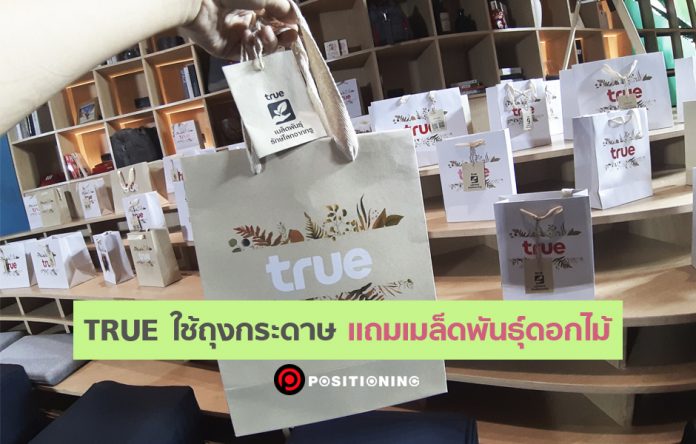 ถึงแม้ว่าทรูไม่ใช่เจ้าแรกที่มีการประกาศเปลี่ยนจากถุงพลาสติกเป็นถุงกระดาษ แต่ความน่าสนใจของถุงกระดาษของทรูนอกจากถุงกระดาษที่ผลิตจากกระดาษคราฟต์รีไซเคิลแล้ว คือการแจก “เมล็ดพันธุ์ดอกไม้” พ่วงไปด้วย