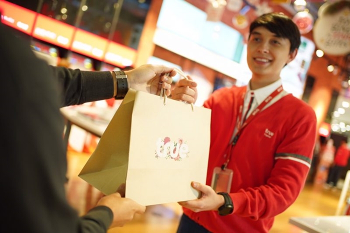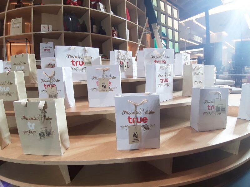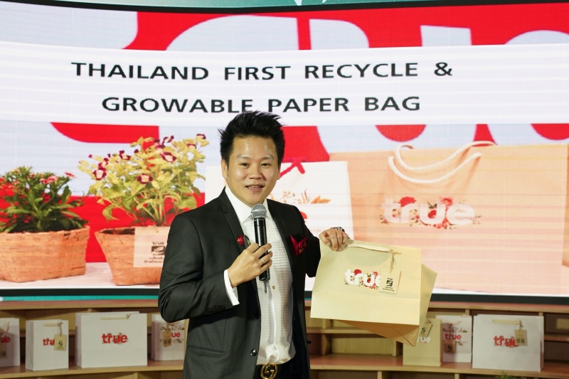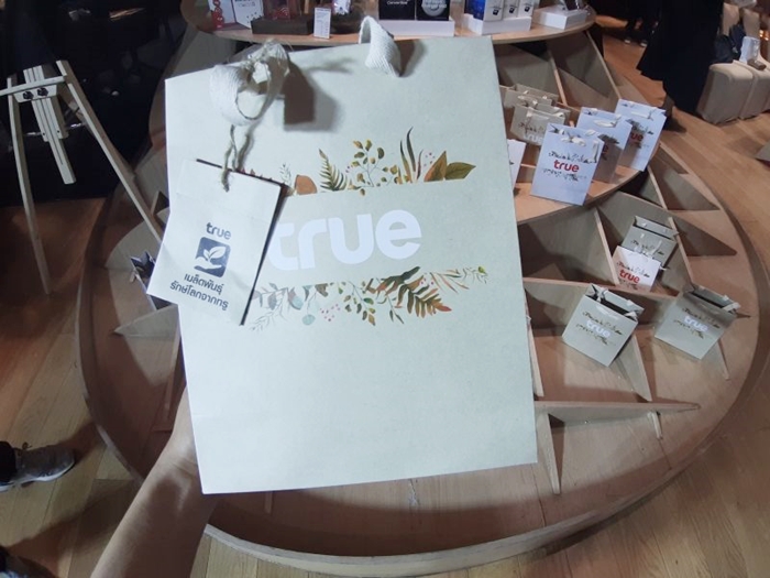 คุณโอลิเวอร์ กิตติพงษ์ วีระเตชะ หัวหน้าคณะผู้บริหารด้านแบรนด์ และการสื่อสาร บมจ. ทรูคอร์ปอเรชั่น เล่าว่า “ในแต่ละปีทรูใช้ถุงพลาสติกในการให้บริการจำนวน 3 ล้านใบต่อปี การใช้ถุงกระดาษจะสามารถลดการปล่อยก๊าซคาร์บอนไดออกไซด์ได้ถึง 600,000 กิโลกรัมต่อปี ถุงกระดาษมีการออกแบบลวดลายดอกไม้ แสดงอัตลักษณ์ใหม่ของทรู เป็นการรีเฟรชแบรนด์ให้ทันสมัยขึ้น ไม่ได้จำกัดแค่ว่าทรูจะต้องมีสีแดง และยังสื่อถึงความเป็นธรรมชาติ รักษ์โลกด้วย”