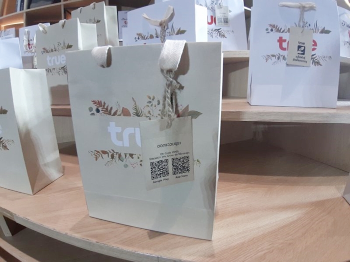 ตอนนี้ทรูได้เริ่มเปลี่ยนเป็นถุงกระดาษทั้งหมด 10 สาขา เป็น 4 สาขาที่เป็นแฟล็กชิพ สโตร์ คือ สาขาไอคอนสยาม, สยามพารากอน, สยามสแควร์ ซอย 2 และ 3 และ ทรูช็อป 6 สาขา คือ สยามพารากอน, เอ็มควอเทียร์, เมกะ บางนา, เซ็นทรัล บางนา, เซ็นทรัล พระราม 9 และเซ็นทรัล พระราม 9 ชั้น 4 ซึ่งเป็นสาขาที่มีทราฟิกผู้ใช้บริการสูง มีการใช้ถุงพลาสติกเยอะที่สุด