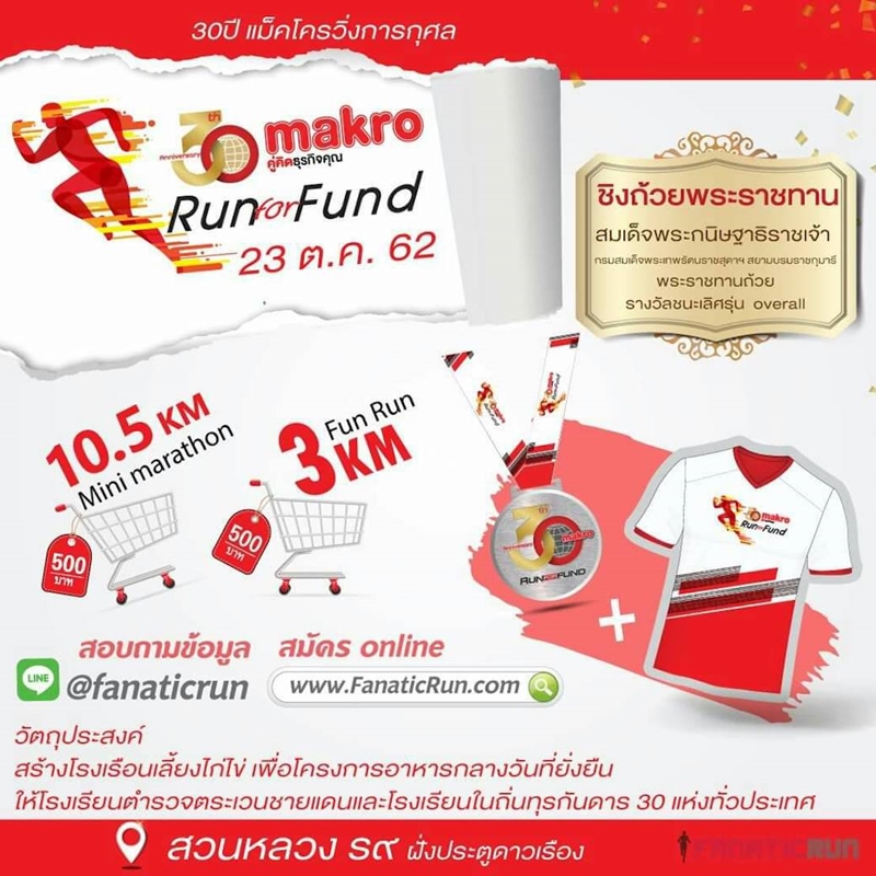 เนื่องในโอกาสที่แม็คโครดำเนินการมาครบ 30 ปี สยามแม็คโครจึงได้จัดกิจกรรม 30 ปี แม็คโครวิ่งการกุศล 30th Makro Run For Fund พุธที่ 23 ตุลาคม 2562 เวลา 04.00-08.00 น ณ สวนหลวง ร๙ ฝั่งประตู ดาวเรือง วัตถุประสงค์ของการจัดงาน เพื่อสนับสนุนการสร้างโรงเรือนเลี้ยงไก่ไข่ เพื่อโครงการอาหารกลางวันที่ยั่งยืนให้โรงเรียนตำรวจตระเวนชายแดนและโรงเรียนในถิ่นทุรกันดาร 30 แห่งทั่วประเทศ