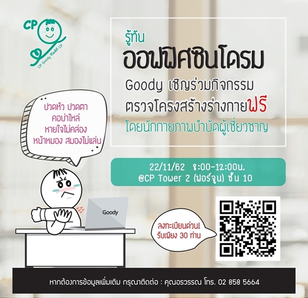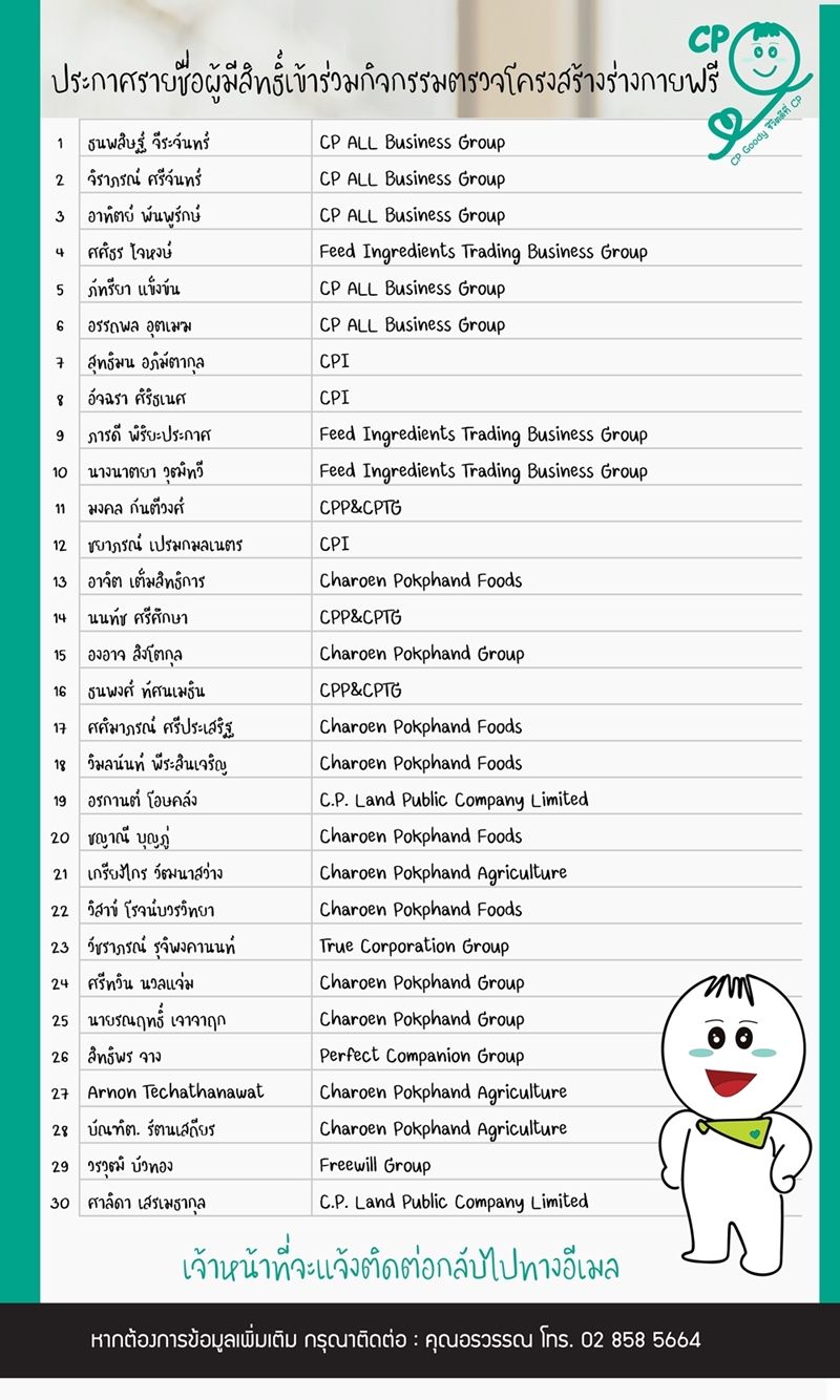 ประกาศรายชื่อผู้มีสิทธิ์เข้ารับการตรวจโครงสร้างร่างกายฟรี กับกิจกรรม “Goody, Good Health, Good life ” ชีวิตดีๆ ที่ CP