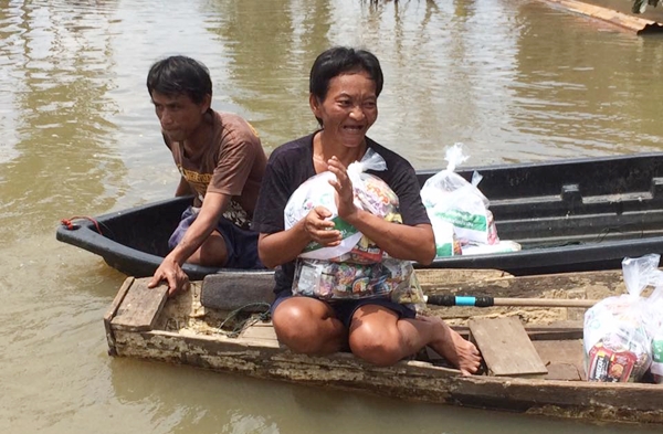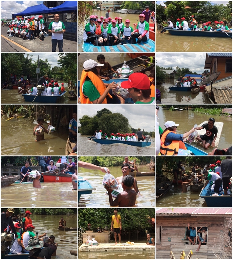 และทันทีที่ซีพีอาสาได้นั่งเรือเพื่อเข้าไปแจกถุงยังชีพและน้ำดื่ม ยิ่งเรือออกจากฝั่ง ก็เห็นแต่มวลน้ำมหึมาท่วมเรือกสวนไร่นา บ้านแทบจะทุกหลังหลังคามิดน้ำ ซีพีอาสาต่างก็ตกใจ และไม่คาดคิดว่าจะเห็นน้ำท่วมมากมาย เราต่างคนต่างตั้งคำถาม แล้วชาวบ้านจะอยู่อย่างไร น้ำจะแห้งหมดเมื่อไหร่ ชาวบ้านจะเอาอะไรกิน และทันทีที่เรือพาทุกคนมาไกลก็พบกับชาวบ้านที่ยังคงอาศัยเพื่อเฝ้าบ้านอันเป็นที่รัก ซีพีอาสาต่างดีใจที่ได้พบชาวบ้าน ขณะที่ชาวบ้านก็ดีใจที่ซีพีอาสามาเป็นกำลังใจพร้อมมอบน้ำและอาหาร
