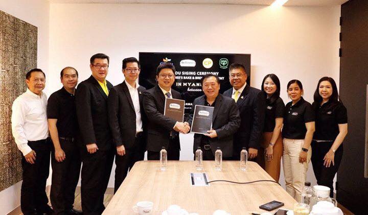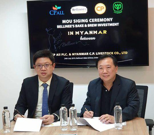 คุณอุทัย ตันติพิมลพันธ์ รองประธานกรรมการ และ คุณวิรัติ วงศ์พรภักดี กรรมการผู้จัดการ ซี.พี. เมียนมา ร่วมลงนามความร่วมมือ กับ คุณชรัส ลิขิตคุณวงศ์ รองกรรมการผู้จัดการ หน่วยงานคัดสรรและเบลลินี่ พรีเมี่ยม คาเฟ่ ซีพี ออลล์ ในโครงการ Bellinee’s Bake & Brew ร้านกาแฟและเบเกอรี่ระดับพรีเมี่ยม สาขาแรกในเมืองย่างกุ้ง ประเทศเมียนมา เพื่อสร้างอาชีพและรายได้ให้ชาวเมียนมา โดยคาดว่าจะเปิดให้บริการปลายปี 2562 นี้