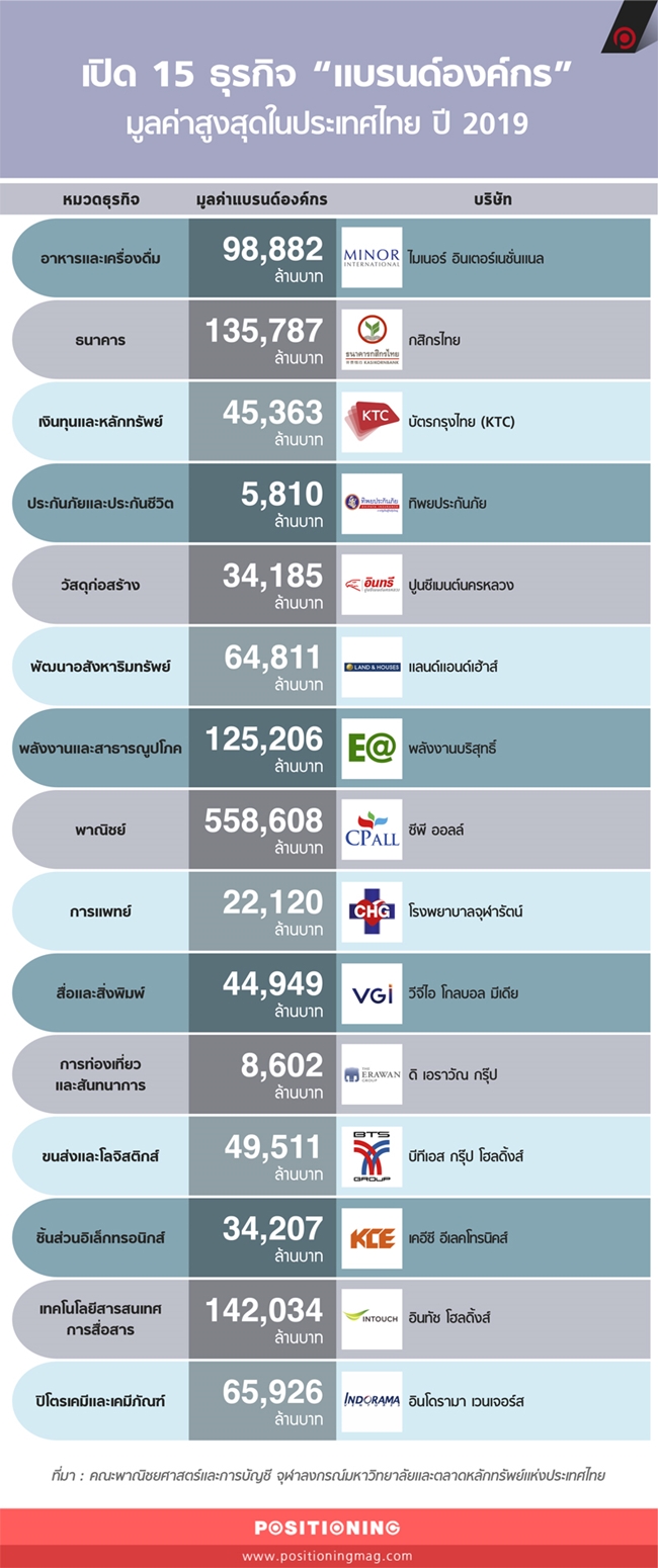สำหรับสุดยอดแบรนด์องค์กรไทยในปีนี้ (Thailand’s Top Corporate Brands 2019) 15 บริษัท จาก 15 หมวดธุรกิจ โดย “ซีพี ออลล์” ในธุรกิจพาณิชย์ มีมูลค่าสูงสุดที่ 558,608 ล้านบาท