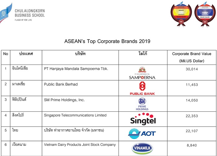 สำหรับรางวัล ASEAN’s Top Corporte Brands 2019 มี 6 รางวัล 1.อินโดนีเซีย บริษัท PT Hanjaya Mandala Sampoerna Tbk มูลค่า 30,014 ล้านดอลลาร์สหรัฐ 2.มาเลเซีย บริษัท Public Bank Berhad มูลค่า 11,453 ล้านดอลลาร์สหรัฐ 3.ฟิลิปปินส์ บริษัท SM Prime Holdings, Inc มูลค่า 14,050 ล้านดอลลาร์สหรัฐ 4.สิงคโปร์ บริษัท Singapore Telecommunications Limited มูลค่า 22,353 ล้านดอลลาร์สหรัฐ 5. ประเทศไทย บริษัทท่าอากาศยานไทย จำกัด (มหาชน) มูลค่า 22,107 ล้านดอลลาร์สหรัฐ และ 6. เวียดนาม บริษัท Vietnam Daily Products Joint Stock Company มูลค่า 8,440 ล้านดอลลาร์สหรัฐ