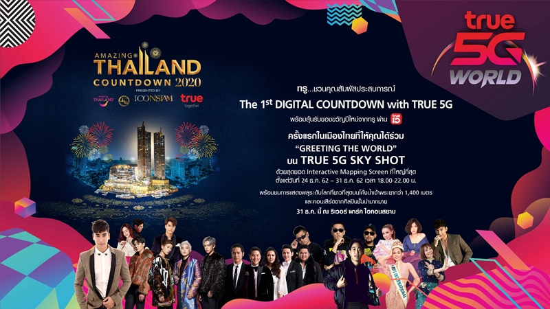 ที่สุดแห่งประสบการณ์เคาท์ดาวน์ระดับโลกแห่งเดียวของประเทศไทย ซึ่งทุกคนสามารถมีส่วนร่วมนับถอยหลังก้าวสู่ปีใหม่แบบดิจิทัลสุดล้ำกับทรู 5G เครือข่ายที่ดีที่สุด ที่กำลังจะเกิดขึ้นเพื่อคนไทย ในงาน Amazing Thailand Countdown 2020 ณ ไอคอนสยาม แลนด์มาร์กใหม่ของโลกริมเจ้าพระยา โดยนำนวัตกรรมจออินเตอร์แอ็กทีฟ TRUE 5G Sky Shot ครั้งแรกในเมืองไทยที่ให้คุณร่วม “Greeting the World” กับสุดยอด Interactive Mapping Screen ใหญ่ที่สุดกว่า 4,400 ตารางเมตร ที่ใช้เทคนิคการยิงภาพความคมชัดสูงไปยังอาคารฝั่งตรงข้าม ให้เกิดแสงสียิ่งใหญ่ โดดเด่นตระการตาในคุ้งน้ำเจ้าพระยาหน้าไอคอนสยาม
