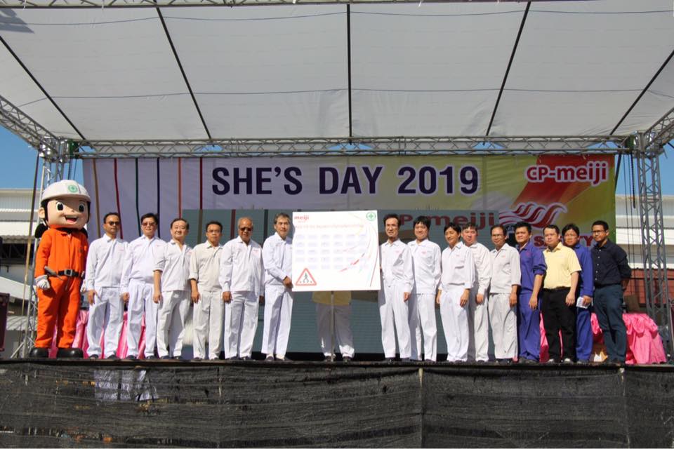 โดย คุณมาซาฮิเดะ ซึเนคาว่า รองกรรมการผู้จัดการอาวุโส เปิดงาน cp-meiji SHE’s Day 2019 เพื่อเน้นย้ำและถ่ายทอดนโยบายการปฏิบัติงานด้วยความปลอดภัยต่อตนเอง ผู้อื่น และสิ่งแวดล้อม ให้ฝังรากลึกอยู่ในทุกแผนก จนกลายเป็นวัฒนธรรมขององค์กร พร้อมทั้งจัดให้มีกิจกรรมสร้างความตระหนักรู้แก้ปัญหาความเสี่ยงหรือเหตุฉุกเฉิน การสร้างทักษะของพนักงานให้ทำงานอย่างปลอดภัย มีการทวนสอบปรับปรุงวัสดุอุปกรณ์ในการทำงานให้มีความปลอดภัยต่อการใช้งานอยู่เสมอ