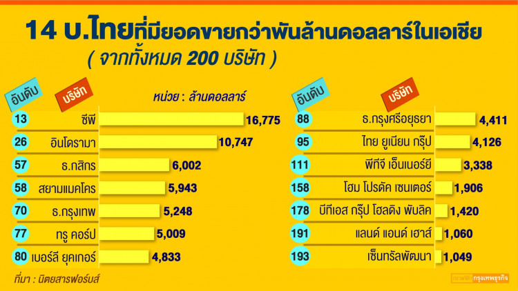 “ฟอร์บส” จัดอันดับบริษัทเอเชียยอดขายเกิน 3 หมื่นล้าน บริษัทไทยติดโผ 14 แห่งนำโดย “ซีพี” ส่วนสยามแม็คโครติดอันดับ58 ทรูอันดับ77