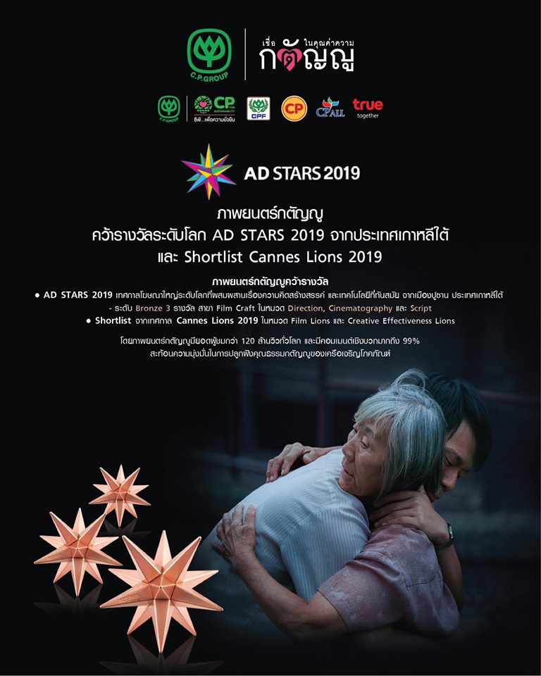 ถือเป็นความภาคภูมิใจอีกครั้งของพวกเราชาวซีพี ภาพยนตร์กตัญญู ของเครือเจริญโภคภัณฑ์ คว้ารางวัล AD STARS 2019 เทศกาลโฆษณาใหญ่ระดับโลกที่ผสมผสานในเรื่องของความคิดสร้างสรรค์และเทคโนโลยีทันสมัย จากเมืองปูซาน ประเทศเกาหลีใต้ โดยได้รับรางวัลระดับ Bronze 3 รางวัล สาขา Film Craft ในหมวด Direction, Cinematography และ Script และ Shortlist จากเทศกาล Cannes Lions 2019 ในหมวด Film Lions และ Creative Effectiveness Lions