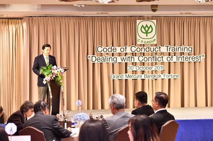 วันที่ 30 ต.ค. 62 เครือเจริญโภคภัณฑ์จัดอบรมจรรยาบรรณธุรกิจแก่ผู้บริหารระดับสูงของบริษัท เครือเจริญโภคภัณฑ์ จำกัด และบริษัทในเครือฯ ในหัวข้อ “การเหลีกเลี่ยงความขัดแย้งทางผลประโยชน์” หรือ “Dealing with Conflict of Interest” โดยมี คุณศุภชัย เจียรวนนท์ ประธานคณะผู้บริหาร เครือเจริญโภคภัณฑ์ เป็นประธาน โดยได้รับเกียรติจาก ศ.ดร.วรภัทร โตธนะเกษม กรรมการผู้จัดการ มูลนิธิสถาบันวิจัยและพัฒนาองค์กรภาครัฐ (IRDP) เป็นวิทยากรบรรยายให้ความรู้เกี่ยวกับเรื่องความขัดแย้งทางผลประโยชน์ และกรณีศึกษา ณ ห้องแพลตตินั่ม ฮอลล์ โรงแรมแกรนด์ เมอร์เคียว ฟอร์จูน