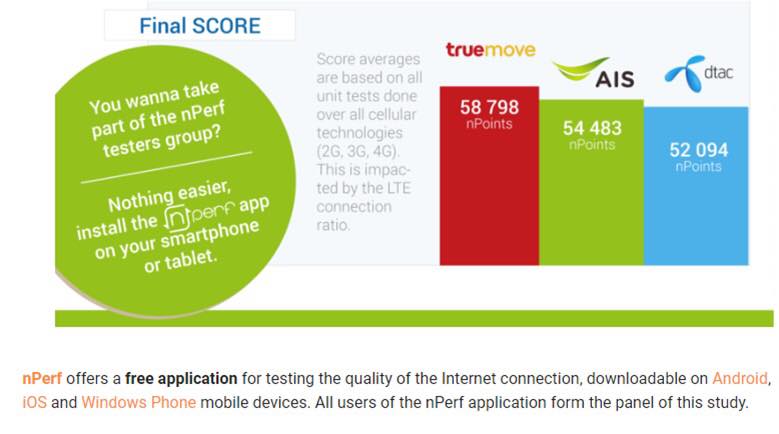 โดยได้ทำการทดสอบทั้งหมด 585,216 ครั้ง ผ่านเทคโนโลยีทั้ง 2G 3G 4G โดยวัดค่าตัวแปรสำคัญๆ อาทิ ค่าความสำเร็จในการเชื่อมต่ออินเทอร์เน็ต (Success Rate) ความเร็วในการอัปโหลดและดาวน์โหลด (Upload & Download Bitrates) ค่าความหน่วงเวลา (Latency) รวมทั้งประสิทธิภาพของการเปิดเว็บหรือบราวซิ่ง และสตรีมมิ่งวิดีโอ (Browsing & Streaming Performance) ซึ่งผลรวมของคะแนนที่ได้ ทรูมูฟ เอช มีคะแนนมาเป็นอันดับ 1 โดยมีคะแนนโดดเด่นที่เหนือกว่า ในเรื่องประสิทธิภาพในการสตรีมมิ่ง (81.59%) และในเรื่องประสิทธิภาพในการบราวซิ่ง (55.53%)