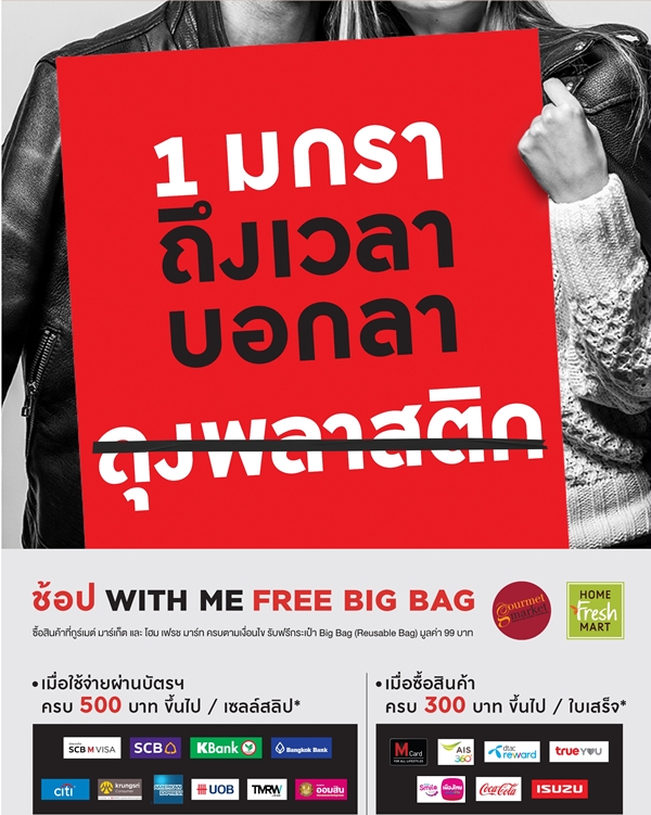 ขณะที่ ‘เดอะมอลล์’ ออกแคมเปญงดแจกถุงพลาสติกแบบจริงจัง แต่ถ้าลูกค้าต้องการใช้บริการจะต้องเสียค่าใช้จ่าย 1 บาท ล่าสุดก็ได้ผนึกพันธมิตรอีก 15 แห่ง ที่สามารถแลกถุงผ้าได้ เพื่อใช้ในการช้อปปิ้ง โดยลูกค้าสามารถแลกรับกระเป๋า Reusable Bag ที่ กูร์เมต์ มาร์เก็ต และ โฮม เฟรช มาร์ท ทุกสาขา ได้ตั้งแต่วันที่ 1 มกราคม 2563 เป็นต้นไป