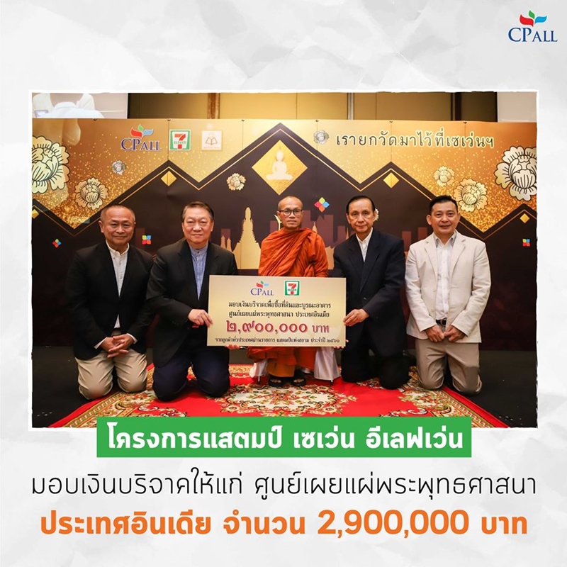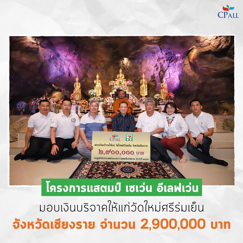 เซเว่น อีเลฟเว่น มอบเงินบริจาคแสตมป์เซเว่นฯ จากลูกค้า เพื่อส่งเสริมพระพุทธศาสนา จากการทำบุญผ่านรายการ ‘แสตมป์รักเมืองไทยประจำปี 2561’ จำนวน 2,900,000 บาท แด่พระอาจารย์เอกชัย สิริญาโณ เจ้าอาวาสวัดใหม่ศรีร่มเย็น เพื่อมอบเงินร่วมสมทบทุนก่อสร้างอาคารทรงธรรม (อาคารอเนกประสงค์) ณ วัดใหม่ศรีร่มเย็น จ.เชียงราย