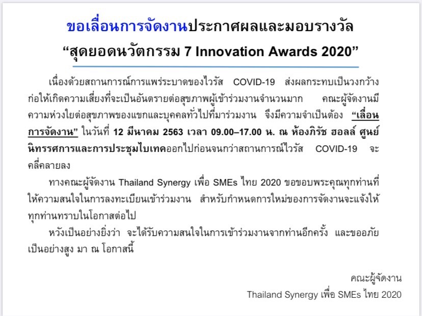 คณะผู้จัดงานมีความห่วงใยต่อสุขภาพของแขกและบุคคลทั่วไปที่มาร่วมงาน จึงมีความจำเป็นต้อง “เลื่อนการจัดงาน” ในวันที่ 12 มีนาคม 2563 เวลา 09.00–17.00 น. ณ ห้องภิรัช ฮอลล์ ศูนย์นิทรรศการและการประชุมไบเทค ออกไปก่อนจนกว่าสถานการณ์ไวรัส COVID-19 จะคลี่คลายลง