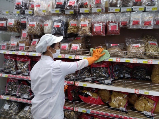 3.ทำความสะอาดพื้นที่ที่มีการสัมผัสบ่อย โดยเพิ่มความถี่ในการทำความสะอาดด้วยน้ำยาฆ่าเชื้อ ทุก 1 ชั่วโมง ตั้งแต่เวลาเปิดห้าง ถึง เวลาปิดห้าง ไม่ว่าจะเป็น ชั้นวางสินค้า, รถเข็นสินค้า ,เคาท์เตอร์บริการต่างๆ ,โทรศัพท์ ,ตู้เอทีเอ็ม,รถวิลแชร์สำหรับลูกค้า เป็นต้น