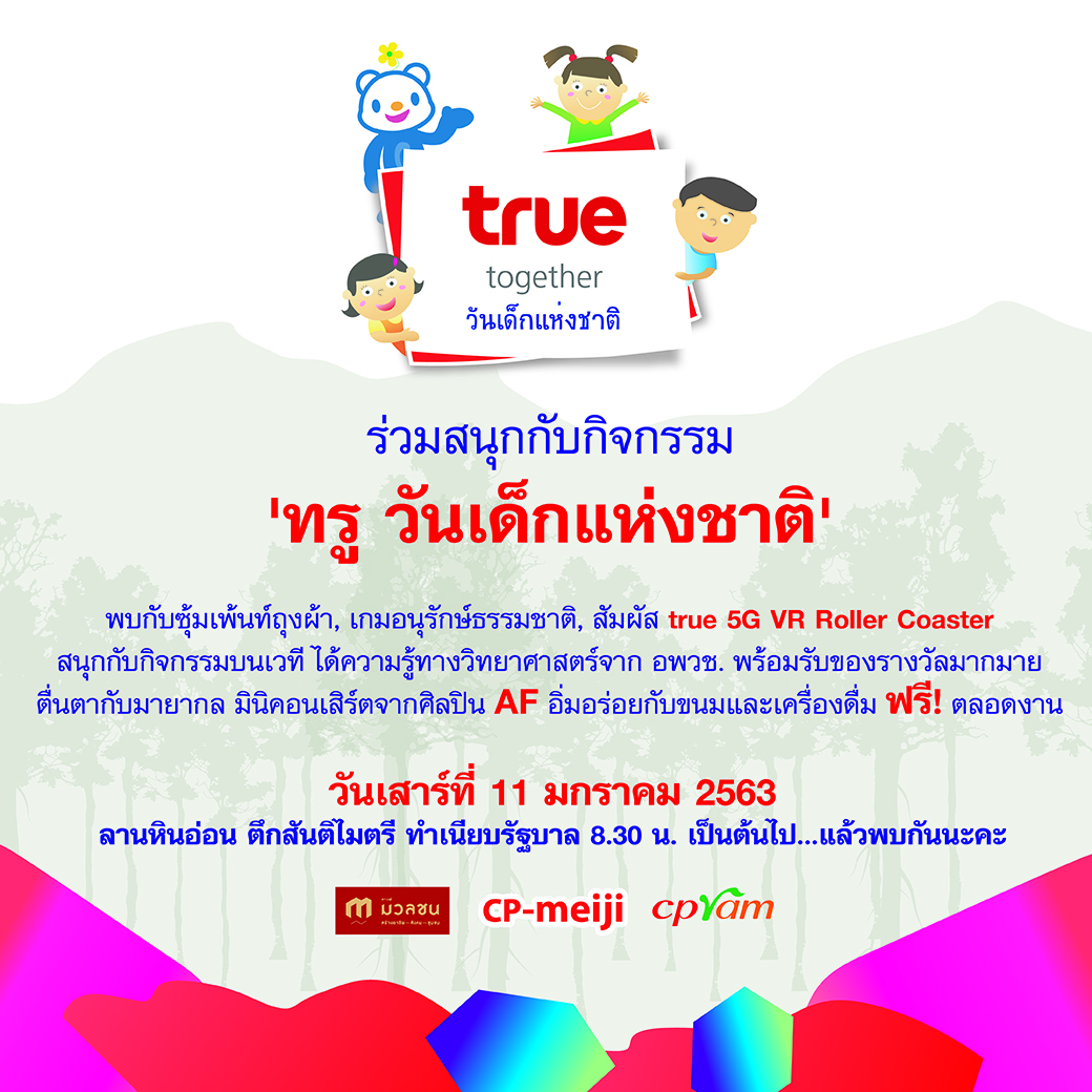 มีข่าวประชาสัมพันธ์จากกลุ่มทรูมาบอกกล่าวชาวซีพี วันเด็กแห่งชาติ 11 มกราคม 2563 นี้ชวนพาครอบครัว ลูกหลานไปร่วมกิจกรรมวันเด็กร่วมสนุกกับกิจกรรม”ทรู วันเด็กแห่งชาติ” พบกับกิจกรรมมากมายเช่นซุ้มเพ้นท์ถุงผ้า เกมอนุรักษ์ธรรมชาติ สัมผัสtrue 5G VR Roller Coaster พร้อมรับของขวัญอีกมากมายภายใต้ความร่วมมือสนับสนุนด้านอาคาร เครื่องดื่มจากกาแฟมวลชน ซีพีเมจิ ซีพีแรม