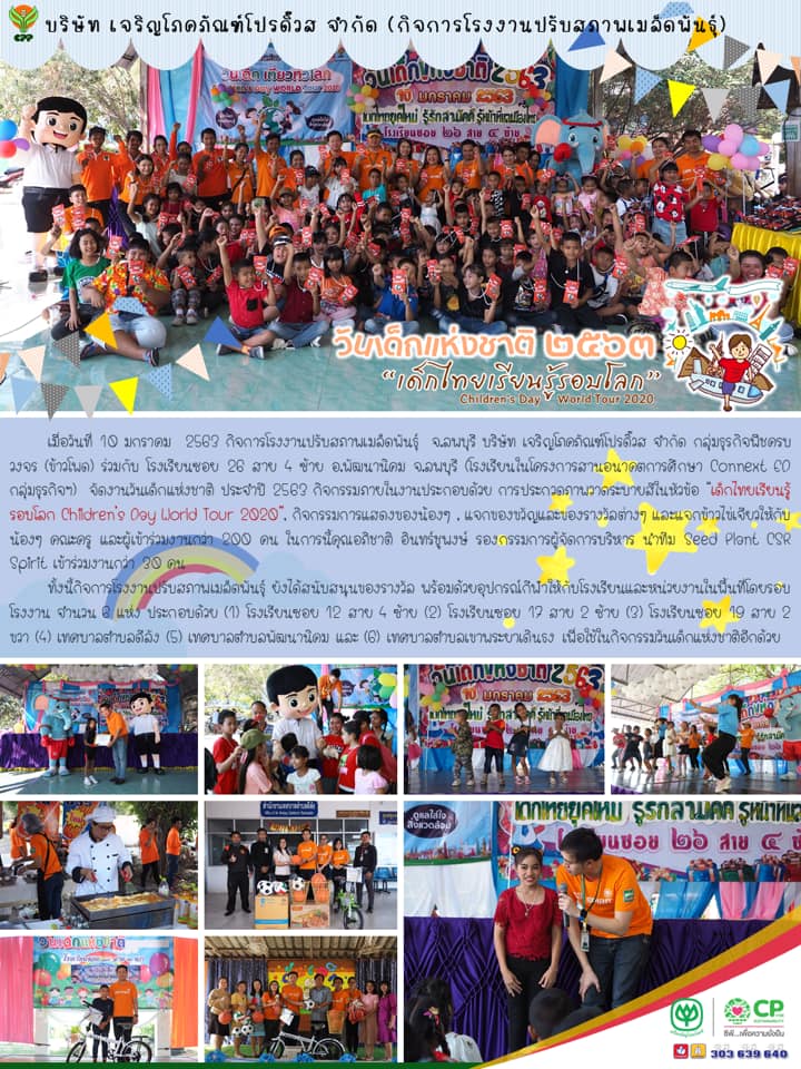 กิจการโรงงานปรับสภาพเมล็ดพันธุ์ บจก.เจริญโภคภัณฑ์โปรดิ๊วส กลุ่มธุรกิจพืชครบวงจร (ข้าวโพด) จัดกิจกรรม “วันเด็กแห่งชาติ 2563 : เด็กไทยเรียนรู้รอบโลก (Children’s Day World Tour 2020)” ณ โรงเรียนซอย 26 สาย 4 ซ้าย อ.พัฒนานิคม จ.ลพบุรี (โรงเรียนในโครงการสานอนาคตการศึกษา Connext ED กลุ่มธุรกิจฯ) ในการนี้ คุณอภิชาติ อินทร์ชูพงษ์ รองกรรมการผู้จัดการบริหาร พร้อมด้วยทีมงาน Seed Plant CSR SPIRIT เข้าร่วมกิจกรรม นอกจากนี้ยังได้มอบของรางวัลพร้อมอุปกรณ์กีฬาให้กับโรงเรียนและหน่วยงานราชการในพื้นที่ จำนวน 6 แห่ง เพื่อใช้ในกิจกรรมวันเด็กแห่งชาติอีกด้วย