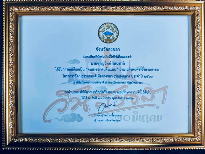 เมื่อวันที่ 11 มีนาคม 2563 ที่ผ่านมาจังหวัดสงขลาจัดให้มีพิธีมอบเกียรติบัตรให้กับบุคคลที่ทำคุณงามความดีเป็นแบบอย่าง เป็นต้นแบบที่ดีแก่เด็ก เยาวชนและประชาชนของจังหวัดสงขลา เนื่องในวันสงขลาโดยมีผู้เข้ารับรางวัล ”คนสงขลาต้นแบบ” จากอำเภอสทิงพระ อำเภอรัตภูมิ อำเภอควนเมือง อำเภอสิงหนคร อำเภอกระแสสินธุ์และอำเภอระโนด โดยมี คุณอำพล พงศ์สุวรรณ รองผู้ว่าราชการจังหวัดสงขลา เป็นประธานมอบ