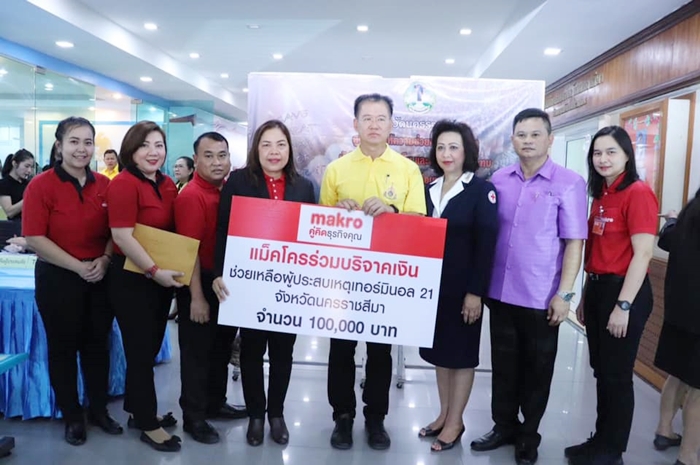 บริษัท สยามแม็คโคร จำกัด (มหาชน) โดย คุณจันทร์เพ็ญ บำรุงไทย ผู้จัดการทั่วไปแม็คโครสาขานครราชสีมา และคุณกนกพร ศรอินทร์ ผู้ช่วยผู้จัดการทั่วไปฝ่ายพัฒนาและบริหารลูกค้า แม็คโครสาขานครราชสีมา 2 เป็นตัวแทนมอบเงินช่วยเหลือผู้ประสบเหตุเทอร์มินอล 21 จังหวัดนครราชสีมา จำนวน 100,000 บาท โดยมี คุณวิเชียร จันทรโณทัย ผู้ว่าราชการจังหวัดนครราชสีมา และภริยาเป็นผู้รับมอบ ณ ศาลากลางจังหวัดนครราชสีมา เมื่อเร็วๆนี้