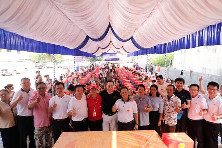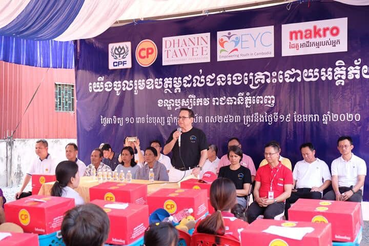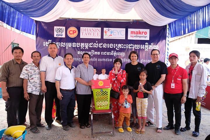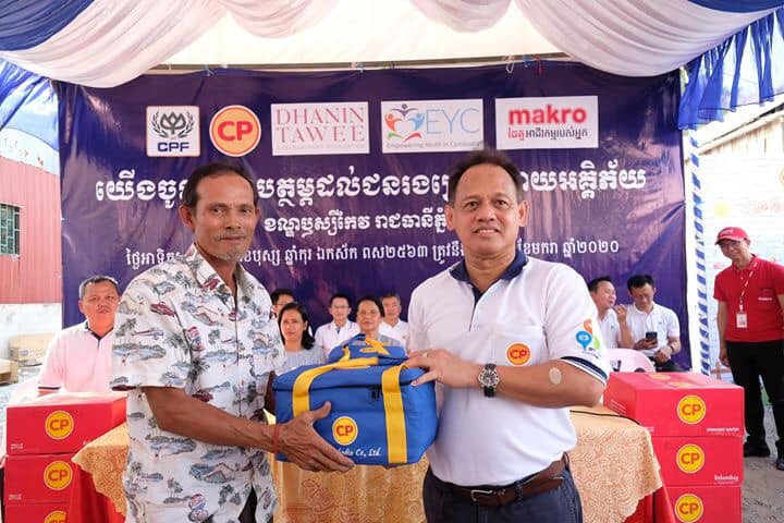 คุณวิทยา เกรียงไกรวิทย์ รองกรรมการผู้จัดการอาวุโส ซี.พี. กัมพูชา ร่วมกับ Mr. Steven Heimberg กรรมการบริหารองค์กร EYC Empowering Youth in Cambodia (EYC), คุณ พชร พานิชกุล ผู้จัดการทั่วไป แม็คโคร กัมพูชา และมูลนิธิธนินท์-เทวี เจียรวนนท์ จัดกิจกรรมมอบเครื่องอุปโภคบริโภค