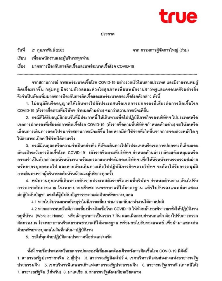 นอกจากนี้บางกลุ่มธุรกิจเช่นกลุ่มทรูได้มีประกาศเมื่อวันที่ 21 กุมภาพันธ์ 2563 ถึงข้อปฏิบัติการเดินทางไปยังประเทศหรือเขตการปกครองที่เสี่ยงต่อการติดเชื้อโรคโควิด-19 เหตุผลความจำเป็นหากต้องมีการเดินทางไปยังประเทศหรือเขตการปกครองที่เสี่ยงต่อการติดเชื้อโรคโควิด-19 หรือหากพนักงานเดินทางกลับจากประเทศหรือเขตปกครองที่มีความเสียง เช่นจีน ญี่ปุ่น สิงคโปร์ ฮ่องกง มาเก๊า เกาหลีใต้ ไต้หวัน มาเลเซีย เวียดนาม เป็นต้น