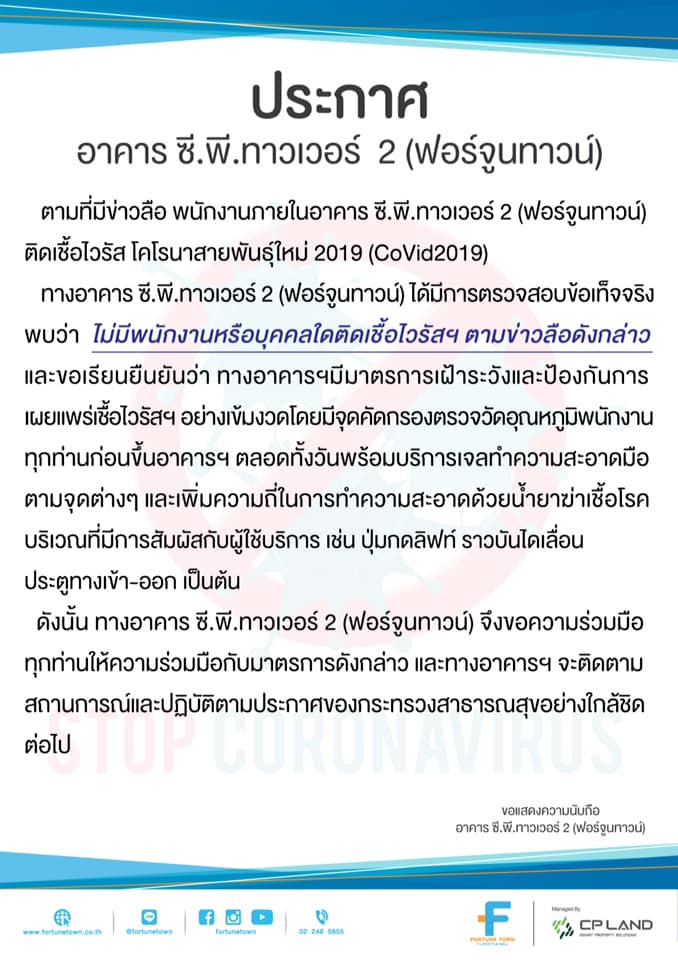 ขณะที่อาคารซีพีทาวเวอร์ 2 หรือฟอร์จูนทาวน์ได้ออกประกาศชี้แจงจากกรณีที่มีข่าวลือพนักงานภายในอาคารฟอร์จูนติดเชื้อไวรัสโควิด-19 ทางอาคารได้ตรวบสอบข้อเท็จจริงพบว่าไม่มีพนักงานหรือบุคคลใดติดเชื้อไวรัสฯตามข่าวลือและยืนยันว่าทางอาคารมีมาตรการป้องกันและเฝ้าระวังอย่างเข้มงวด โดยมีจุดคัดกรอง ตรวจวัดอุณหภูมิพนักงานทุกคนก่อนขึ้นอาคาร การบริการเจลทำความสะอาดมือตามจุดต่างๆ