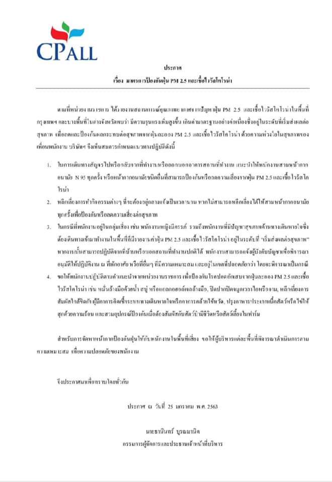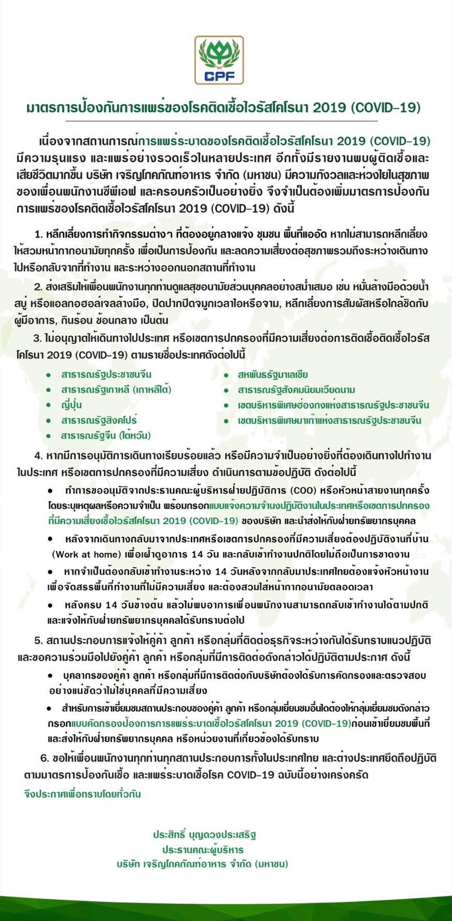 จากสถานการณ์การระบาดของไวรัสโควิด-19 ที่ขยายพื้นที่ออกไปในภูมิภาคต่างๆของโลกรวมทั้งสถานการณ์ที่มีการระบาดใหม่ในหลายประเทศ ด้วยความห่วงใยสุขภาพเพื่อนพนักงานและครอบครัวของกลุ่มธุรกิจต่างๆยังคงเน้นย้ำให้พนักงานปฏิบัติตามมาตรการป้องกันและเฝ้าระวังไวรัสโควิด-19 ของเครือฯ