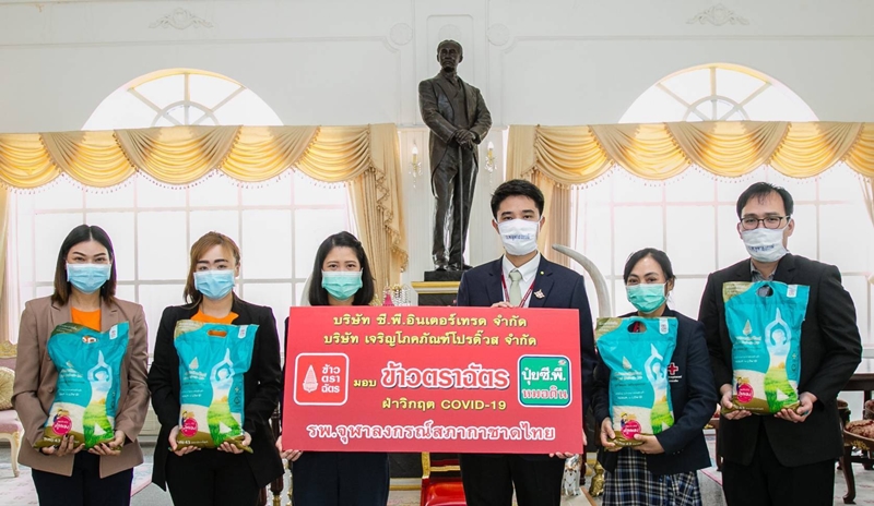 ผศ.(พิเศษ) นพ.ปิยพันธ์ พฤกษพานิช ผช.ผอ.รพ.จุฬาลงกรณ์ สภากาชาดไทย ด้านระบบห้องปฏิบัติการ รับมอบข้าวสารตราฉัตรไลท์ ขนาด 5 กก. จำนวน 1,500 กิโลกรัม จากคุณสุทธินันท์ สันติประเสริฐ ผู้จัดการฝ่ายขาย RU Health & Wellness ผู้แทนจากข้าวตราฉัตร