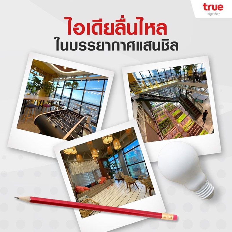 โดยเพจ True Together นำเสนอว่าแค่ก้าวเข้ามาในทรูก็ต้องร้องว้าว!! เพราะออฟฟิศนี้ทั้งชิลและชิคด้วยบรรยากาศสุดคูล ในออฟฟิศแบ่งออกเป็นหลายโซน แต่ที่น่าสนใจเป็นพิเศษ คือโซน Co-working space ที่จะได้เปลี่ยนบรรยากาศการทำงานด้วยโซนผ่อนคลายที่ให้พนักงานได้พักเบรค มีทั้งโต๊ะพูล, หน้าผาจำลอง โซฟานุ่มๆ ให้นั่งชิล ห้องซ้อมดนตรี หรือแม้กระทั่งมุมตู้กด 7-11 ไว้ซื้อของว่างเวลาหิวได้ตลอดเวลา