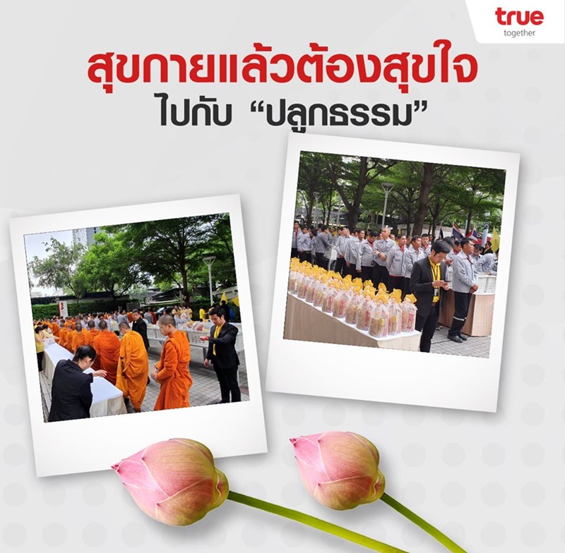 สุขใจด้วย “ปลูกธรรม” ซึ่งทรูจัดกิจกรรมดีๆ ของชาวพุทธ ทั้งการทำบุญตักบาตรในเทศกาลสำคัญ หรือการสร้างความสุขใจด้วยบรรยากาศพิเศษโดยพระอาจารย์ เป็นต้นรวมไปถึงการดูแลในเรื่องสุขภาพกาย สุขภาพการเงิน