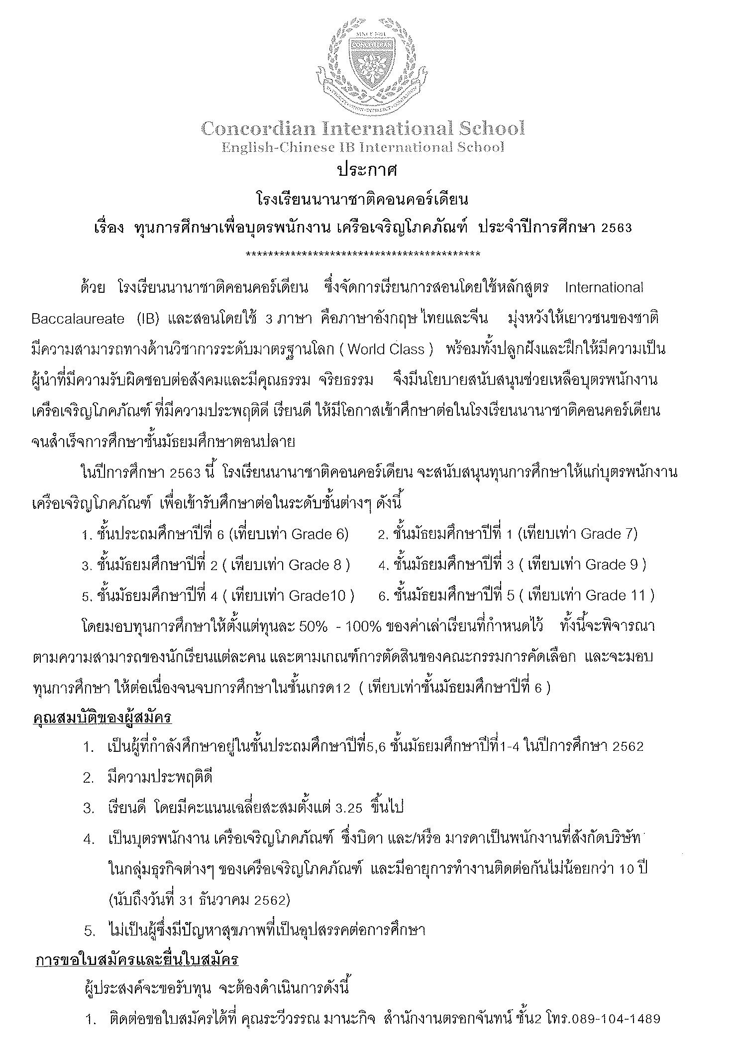 รายงานข่าวจากโรงเรียนนานาชาติคอนคอร์เดียน ที่ก่อตั้งโดย คุณวรรณี เจียรวนนท์ รอส์ส เปิดเผยว่าทางโรงเรียนฯเตรียมมอบทุนการศึกษาเพื่อบุตรพนักงาน เครือเจริญโภคภัณฑ์ ประจำปี2563 โดยจะสนับสนุนทุนการศึกษาให้แก่บุตรพนักงาน เครือเจริญโภคภัณฑ์เพื่อเข้ารับการศึกษาต่อในระดับชั้นต่างๆดังนี้