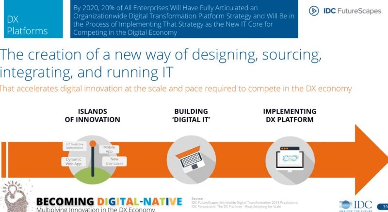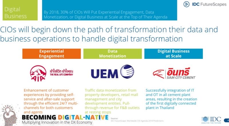 ภายในปี 2563 20% ขององค์กรขนาดใหญ่ในประเทศไทยจะมีการกำหนดกลยุทธ์การสร้าง “แพลตฟอร์มดิจิทัลทรานส์ฟอร์เมชัน” ที่ชัดเจน และ จะเริ่มดำเนินการติดตั้งแพลตฟอร์มนี้เพื่อเป็นเครื่องมือหลักในการแข่งขันในเศรษฐกิจดิจิทัล