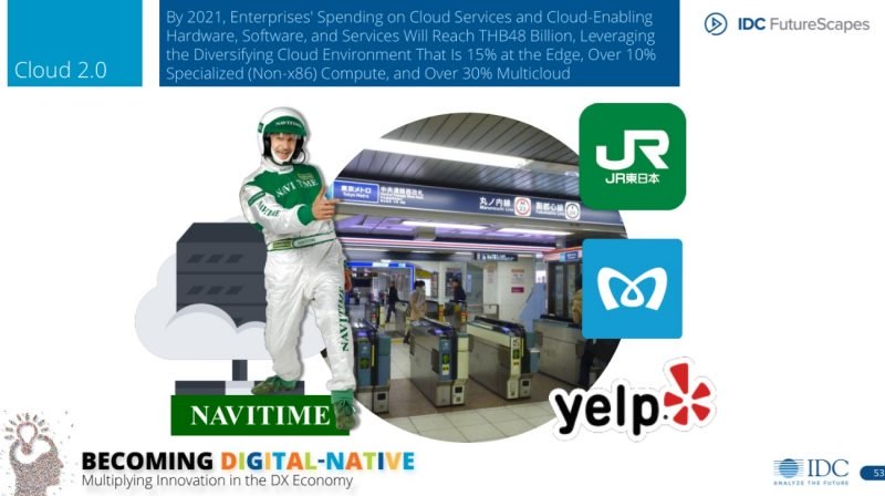 จะได้เห็น Cloud เข้าสู่ยุค 2.0 มีการออกแบบตอบรับความต้องการเฉพาะ โดยที่ภายในปี 2564 การลงทุนขององค์กรในบริการคลาวด์ และฮาร์ดแวร์ ซอฟต์แวร์ และบริการที่ใช้งานผ่านคลาวด์ จะเพิ่มจนสูงกว่า 4.8 หมื่นล้านบาท โดยจะใช้งานระบบคลาวด์ที่หลากหลายขึ้น ซึ่งจะอยู่ที่ “Edge” 15% จะมีการใช้เครื่องมือคอมพิวต์เฉพาะทาง (ไม่ใช่ X86) กว่า 10% และจะมีการใช้งานมัลติ คลาวด์กว่า 30%