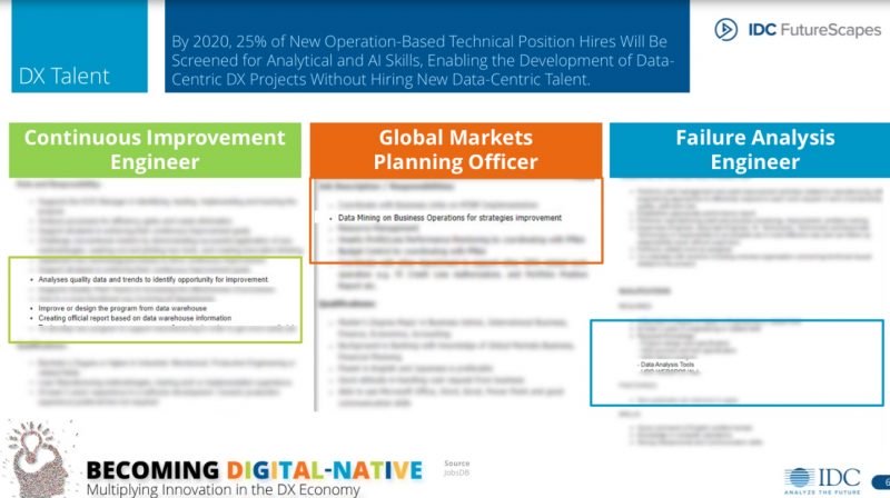 จริงๆ แล้วบุคลากรในประเทศยังไม่พร้อมที่ตะเข้าสู่ยุคดิจิทัล ทรานฟอร์เมชั่นเท่าไหร่ แต่ภายในปี 2563 25% ของตำแหน่งงานด้านเทคนิคที่เปิดใหม่ จะต้องการผู้สมัครที่มีทักษะการวิเคราะห์ และเอไอ เพื่อช่วยองค์กรให้ดำเนินโครงการทรานส์ฟอร์เมชันที่เกี่ยวข้องกับดาต้าได้ โดยไม่จำเป็นต้องว่าจ้างบุคลากรด้านดาต้าโดยเฉพาะ โดยที่ตำแหน่งอื่นๆ จะต้องมีสกิลทางด้านไอทีด้วย