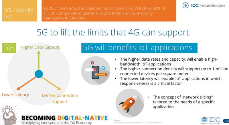 ภายในปี 2564 บริการ 5G จะช่วยผลักดันการใช้งาน IoT และจะกระตุ้นให้ 50% ของ 500 บริษัทที่ใหญ่ที่สุดของไทยลงทุนในโซลูชันด้านการจัดการการเชื่อมต่อเป็นมูลค่ากว่า 200 ล้านบาท อุปกรณ์ต่างๆ จะรองรับโซลูชั่นของ IoT ได้