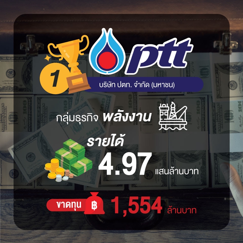 โดย TOP 6 ของ บริษัทที่มีรายได้สูงสุด ยังคงเป็นบริษัทขนาดใหญ่ในตลาดหลักทรัพย์ อย่าง PTT ที่มีรายได้สูงถึง 4.97 แสนล้านบาท แต่สิ่งที่น่าสังเกตในรอบนี้ แม้ว่า PTT จะมีรายได้ที่สูงที่สุด แต่กลับมีผลงานในไตรมาสที่ 1 ขาดทุน 1,554 ล้านบาท