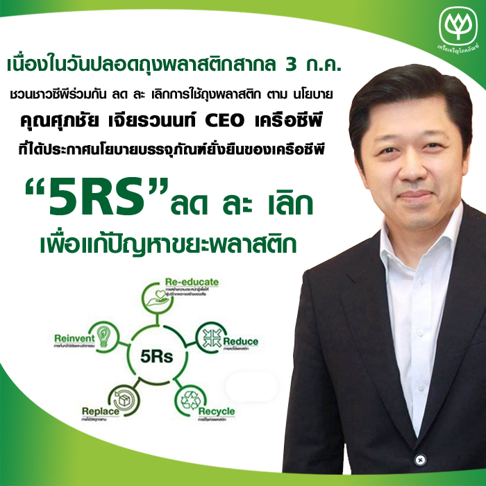ชวนชาวซีพีร่วมกัน ลด ละ เลิก การใช้ถุงพลาสติก ตามนโยบาย คุณศุภชัย เจียรวนนท์ เพื่อร่วมกันสู่เป้าหมายที่วางไว้ด้วยหลัก 5R